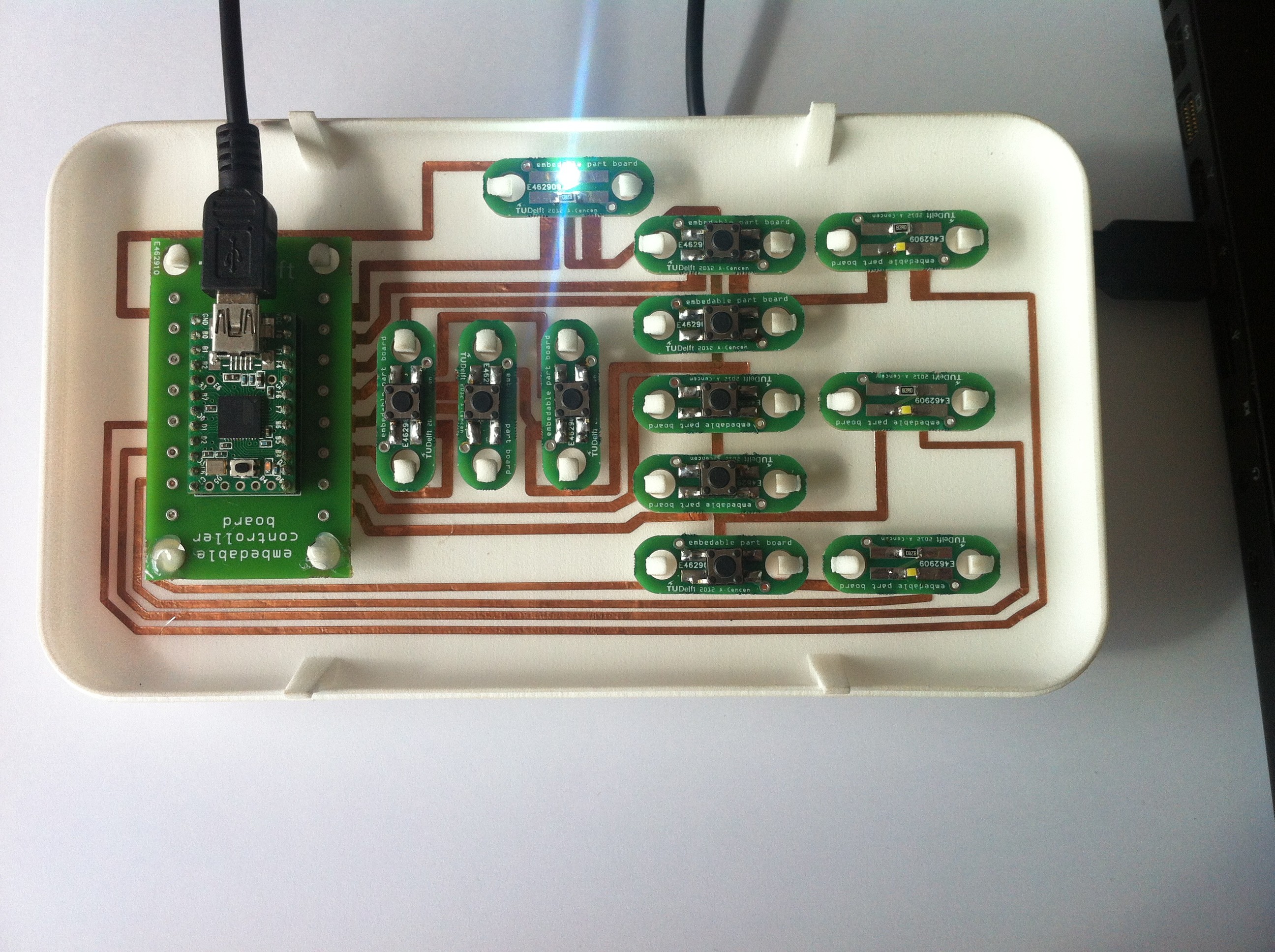 Designed and built a customisable USB controller as the proof-of-concept product, with snap-fit components in conductive channels printed into the enclosure, removable and reusable in new configurations.