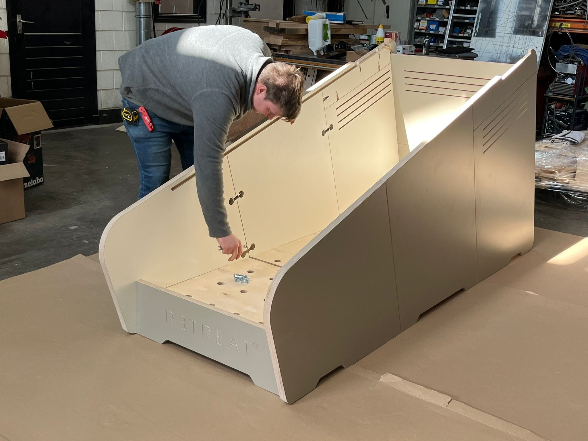 Booztr had a prototype for a flat-pack sleeping pod aimed at hospitality and workplace environments, but it was not ready for series production. I took the product through multiple design iterations, leading a complete redesign of the shutter system from ideation to hands-on prototyping, improving the panel structure and assembly logic, and coordinating with a production partner to get it built at the right quality. The pod is now series-ready and preparing for market launch.