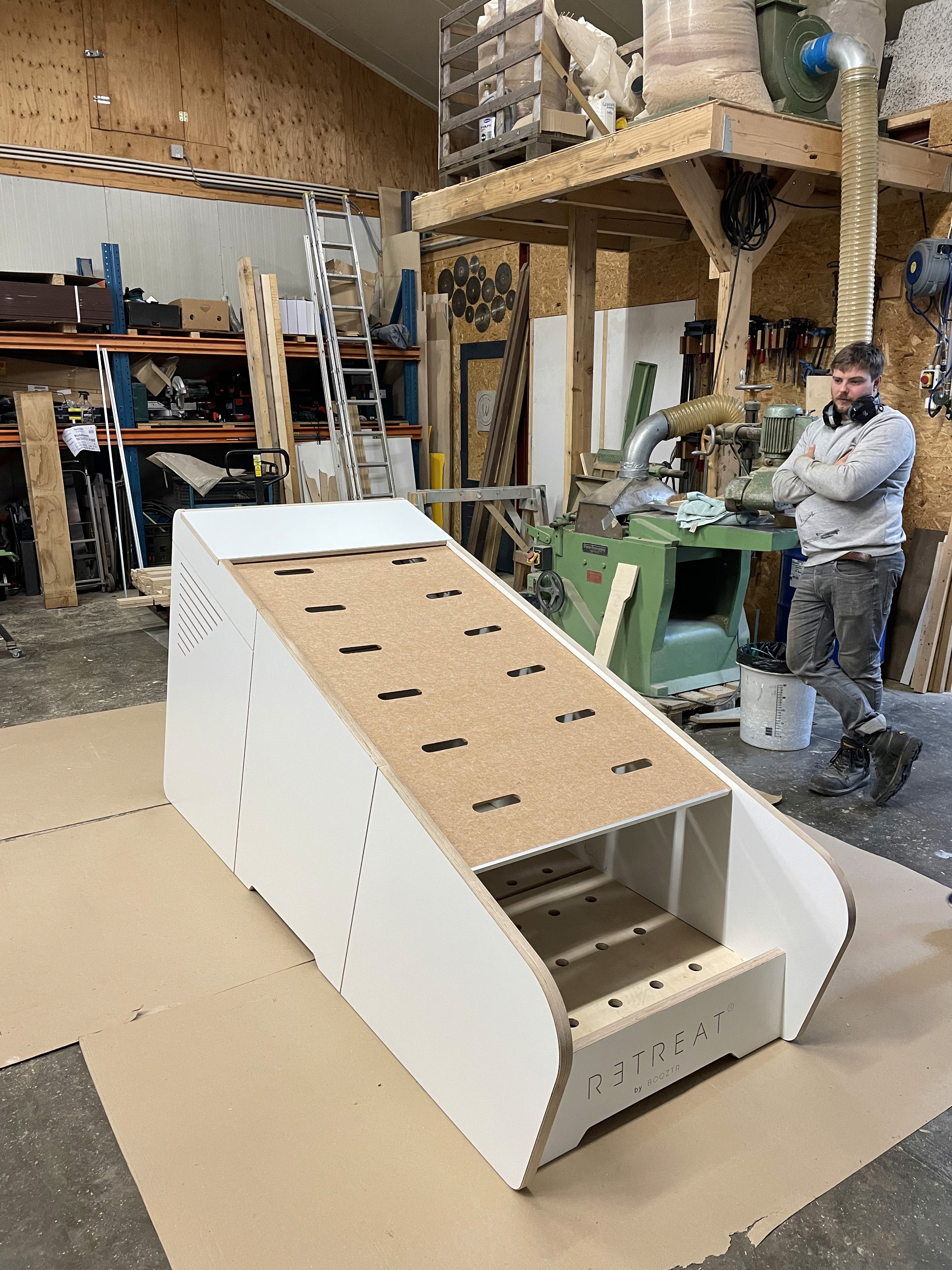 Booztr had an initial prototype but it was not ready for series production. The assembly logic was unresolved, the user experience inside the pod needed significant improvement, and the shutter system that closes the pod to block light while allowing air in required a complete redesign. Finding the right production partner at the right quality level and price point had also proven difficult. The founders needed someone who could hold all of these threads simultaneously and move the product forward in a hands-on way.