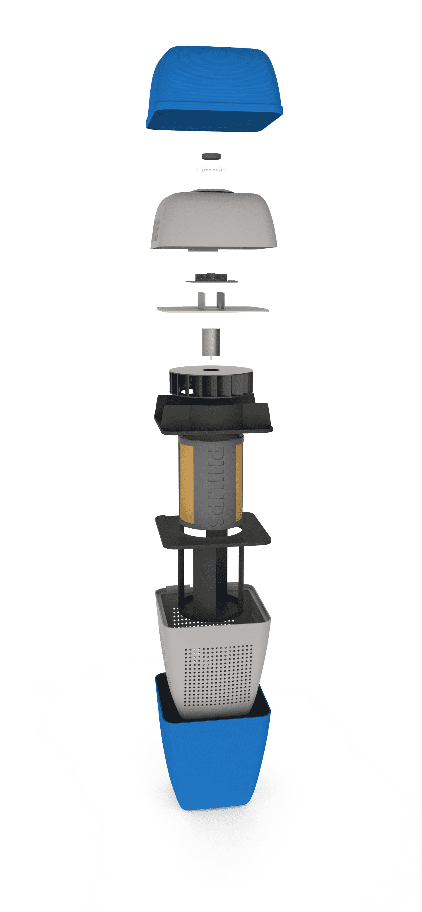 Replaced complex sensors and interfaces with a single push-button and six LEDs, added a washable pre-filter to extend filter life, and sized the unit for room-level use, reducing the required filter size and running costs.